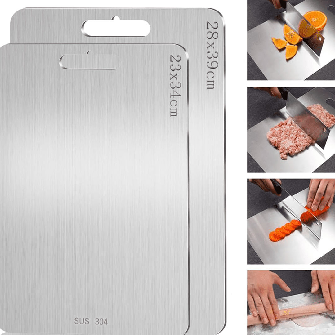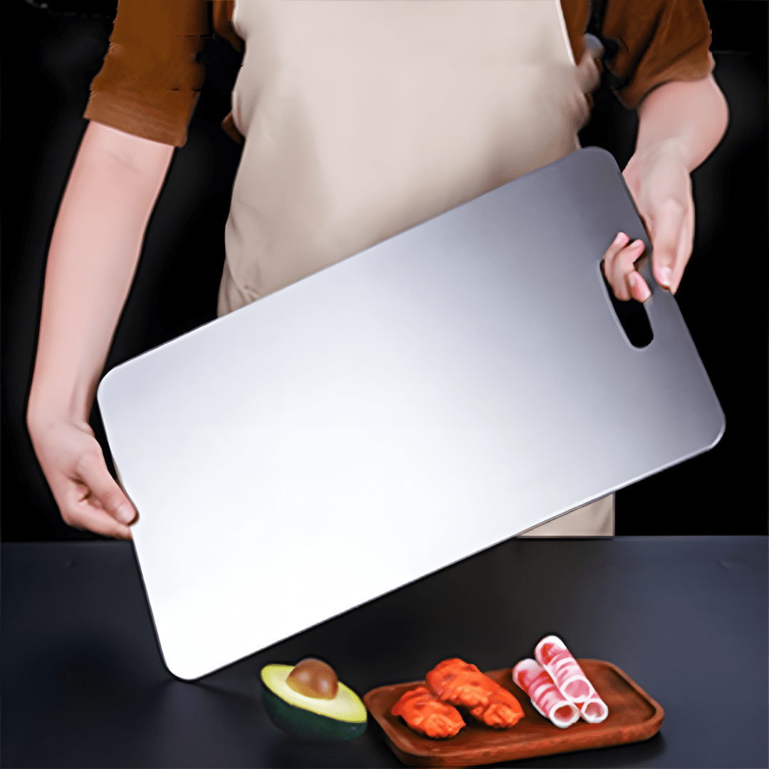 Choose a high-end cutting board that combines strength and elegance! Made from 100% pure titanium, it offers exceptional durability and is resistant to rust and impact. Its non-porous surface ensures perfect hygiene by preventing the penetration of bacteria and odors, while eliminating any risk of microplastics or wood splinters.